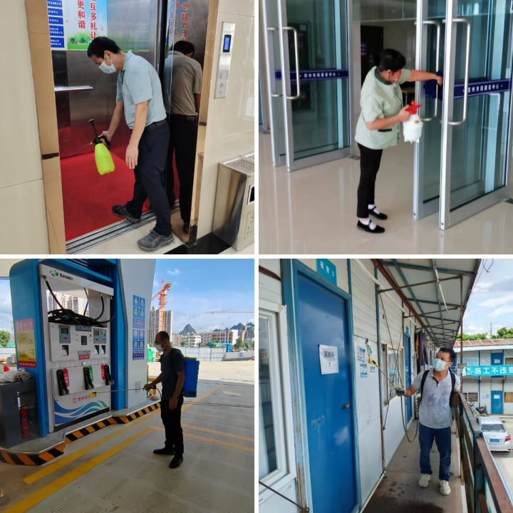 消殺人員全面對(duì)集團(tuán)辦公區(qū)域樓道、會(huì)議室、衛(wèi)生間等部位進(jìn)行環(huán)境消殺,對(duì)辦公室門(mén)把窗鎖、電腦鍵盤(pán)鼠標(biāo)、座椅扶手等頻繁接觸部位進(jìn)行清潔消毒;對(duì)物管小區(qū)大門(mén)、單元入戶門(mén)、小區(qū)綠化帶、樓梯通道、電梯轎廂、樓梯扶手、垃圾桶、信報(bào)箱等各公共區(qū)域進(jìn)行全面擦洗消毒,及時(shí)清運(yùn)小區(qū)垃圾,清理衛(wèi)生死角;對(duì)平安立體停車庫(kù)、平安加油站、姑婆山小鎮(zhèn)路花新村項(xiàng)目、城東污水處理廠項(xiàng)目等開(kāi)展防控消殺。僅一天時(shí)間,城投集團(tuán)共消殺辦公場(chǎng)所處,項(xiàng)目工地個(gè),物管小區(qū)個(gè),進(jìn)行了“無(wú)死角、無(wú)盲區(qū)、全覆蓋”的地毯式消毒作業(yè)。
