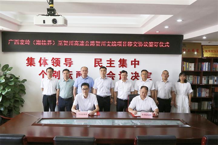 賀州支線西接麥賀高速公路主線,東經(jīng)連賀高速公路與二廣高速相連,公路建設(shè)打通了旺高工業(yè)基地、西灣工業(yè)基地與華北、華中及沿海地區(qū)的聯(lián)系通道,工程建設(shè)對優(yōu)化賀州市路網(wǎng)結(jié)構(gòu),構(gòu)建廣西東部和中部地區(qū)的重要門戶和樞紐,落實賀州市“十四五”規(guī)劃及綜合交通運輸發(fā)展規(guī)劃,提升高速公路過境效率,加速助力實施鄉(xiāng)村振興,促進(jìn)賀州市經(jīng)濟(jì)社會發(fā)展具有重要意義。項目移交協(xié)議的簽訂,標(biāo)志著項目正式移交廣西交投集團(tuán)實施,為項目快速推進(jìn)打下堅實基礎(chǔ)。簽約儀式后,雙方還就如何加快項目建設(shè),不斷深化交流合作進(jìn)行了探討。