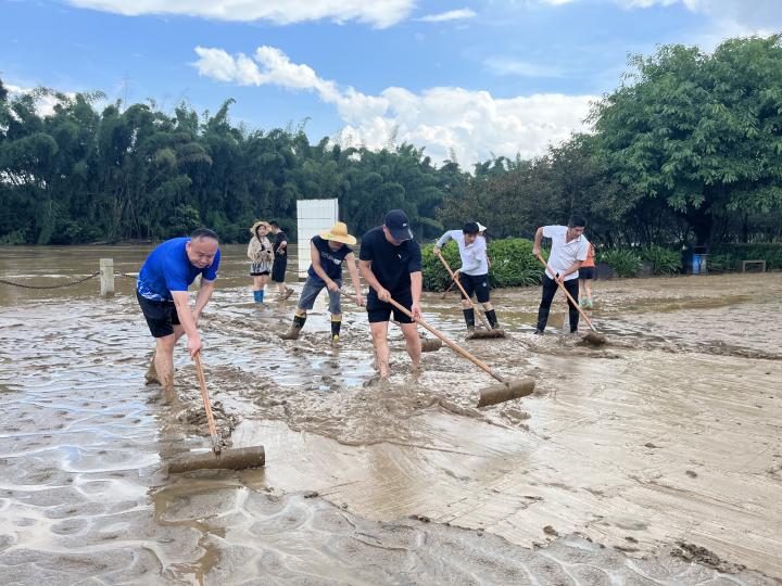 發布時間:2024-06-17 作者:文字:陳曉雯 圖片:程梅娟 來源: 審核:葉茂桃 吳姍近日,我市遭遇強降雨,賀江水位迅猛上漲,城區部分區域范圍遭受不同程度的災害影響,沿江而建的北堤公園因河水上漲也被洪水淹沒。隨著洪水退去,大量淤泥、雜物殘留在北堤公園河岸兩側。為盡快恢復北堤公園美麗整潔面貌,6月16日,城市運營公司副總經理劉立忠率領城投物業公司全體干部職工攜帶高壓水管、鐵鏟、掃帚等工具趕赴北堤公園內澇路段清理積水、淤泥。